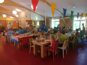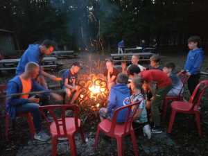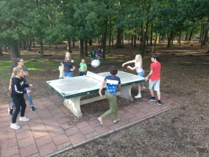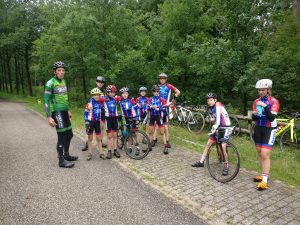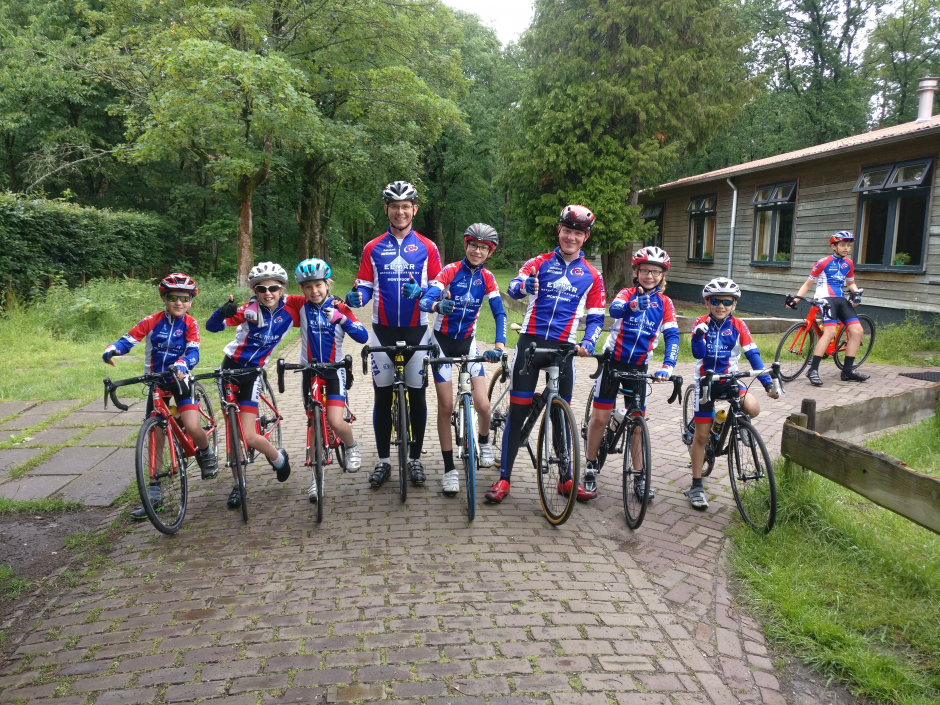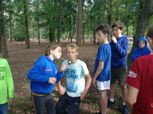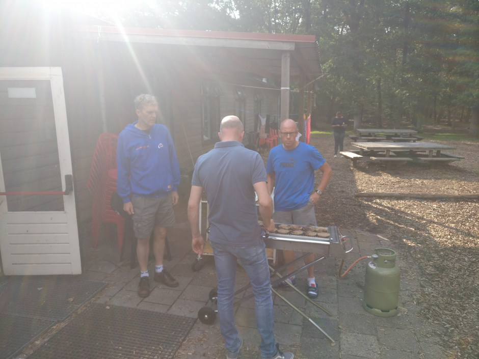 Moet kunnen op een kamp zullen we maar denken. Als er de volgende dag maar weer vrolijk wordt gerammeld en dat werd er hoor. Oogjes klein, maar iedereen verscheen weer aan het ontbijt en ook leek niemand er minder vrolijk van te worden dat het fietsen ivm de regen een uurtje werd uitgesteld. Gelukkig was het omstreeks 11 uur toch droog genoeg om te vertrekken en de verschillende groepen gingen aan de slag. Mooie rondjes in de buurt van Austerlitz, bijvoorbeeld over de Amerongse berg, maar ook wat uitslovers die pas bij de Duitse grens hun fiets omdraaiden (respect mannen... 125km op de teller). De oudere groep kon daardoor echter niet aan de klimtijdrit deelnemen, waar door de andere groepen nog even het laatste stukje energie eruit geperst werd. Tenminste dat dachten we, maar een goede bbq zorgt er blijkbaar voor dat iedereen weer uren door kan. Prima vlees, super salade, lekker in het zonnetje, heerlijk ontspannen en daarna allemaal stuiteren bij de disco. DJ KRIS zette het spul weer op z'n kop. Daarna werden de jongste groepen wederom naar de slaapzalen gestuurd, zodat ze zonder begeleiding konden verder feesten en deed Bram met de oudste groepen het spel Weerwolven (iets met een heks, een tovenaar, het geheime meisje en weinig overlevenden), maar iedereen kwam in ieder geval weer met een brede lach terug van de warme vuurkorf.