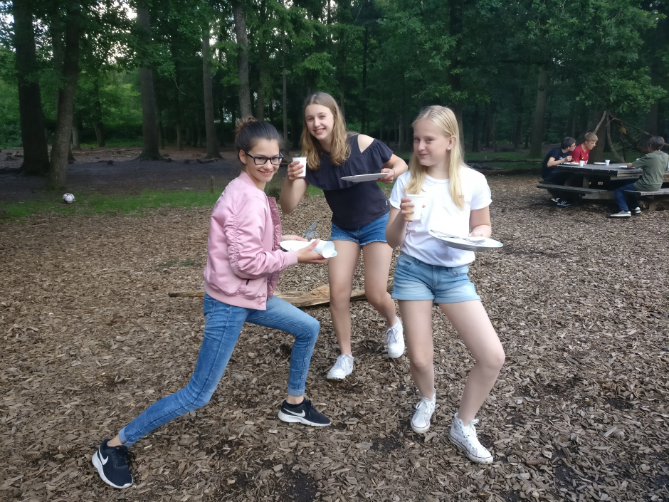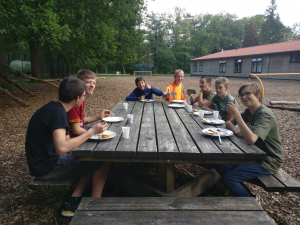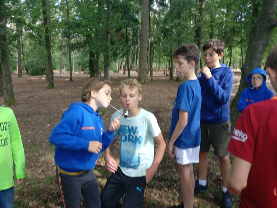 Op zondagochtend was het de beurt aan de leiding om eens wat herrie te maken op de slaapkamers onder het welbekende motto; 's avonds een vent, 's ochtends ook 100%. Enthousiast schoof het spul weer aan tafel en waren er heuse vaderdagkado's en zelfs een gedichtje. Al die oude mannen snel de zonnebrillen op... en door natuurlijk <slik>... naar het spellencircuit van Yaron. Allemaal leuke verschillende dingen, snoephappen, met 6 man jezelf opstapelen op een halve krant, suikerklonten estafette enz enz. Daarna opruimen en nog een mini-voetbaltoernooi, waar een VAR wel een rode kaart of 15 had uit kunnen delen, maar dat mocht de pret niet deren. En ja... toen was het al weer tijd voor de laatste lunch en de terugreis. Wederom heerlijk fietsweer, mooie routes om Utrecht heen en allemaal weer veilig thuis, waar de ouders EN DE PANNEKOEKEN klaar stonden.