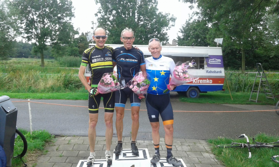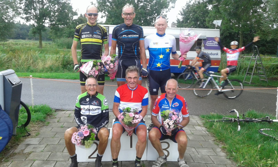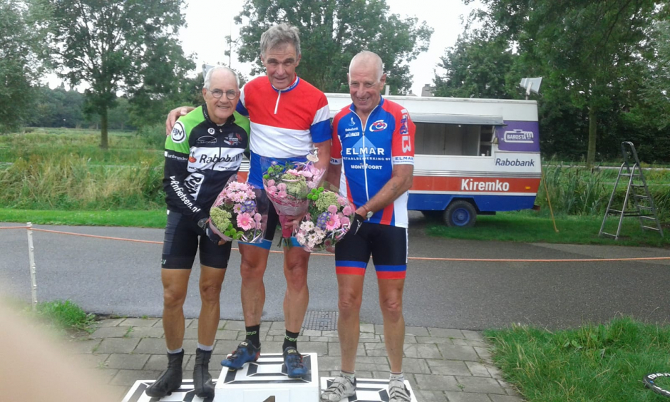 Bij de 70+ ook een klein groepje; hier 11 renners aan de start. De minst jongste van het stel , was hier onze eigen WTC Woerden renner Kees Verdouw, die net vorige maand 75 kaarsjes heeft uitgeblazen. Na de eerste loze ronde ging gelijk Spronk aan de haal. Hij zou een mooie solo rijden van zo’n 6 ronden, bleef wachten en hopen wat renners de sprong zouden maken, maar dat gebeurd helaas niet voor hem. Dus na zo’n kwartiertje koers zaten alle mannen bijeen. Alsof het zo afgesproken was en frappant om te zien, vooraan steeds dezelfde renners (Blom, van Bavel, Zantingh, Martin) die een uitval deden en achteraan steeds dezelfde renners die blij waren om weer te kunnen aansluiten. In het verloop van de koers zouden dan ook Nieuwenhuijsen, Brouwer en Balm de rol definitief moeten lossen. Na 40 minuten zagen we ook een breukje in de groep. 5 man voorop, daarachter kort gevolgd door 3 man (Nederlands kampioen van Bavel achteraan; overigens de jongste 70+, want hij wordt in november pas 70 ). Was dit de slag ? Nee dus, groep weer bijeen en direct Hans van Bavel ervandoor. Het leek wel of zijn medestrijders een plaspauze hadden genomen, zo groot wat het gat meteen. Leen Blom ging het ook alleen proberen, maar de groep liet hem niet meer dan 2 ronden vooruit rijden. Van Bavel ging op zijn eigen tempo in mooie cadans lekker door; kreeg net voor het uur de groep te pakken, welke al zo met de verwachte sprint om de 2e plaats bezig was, dat ze Van Bavel maar gewoon lieten doorrijden. Van Bavel dus de winnaar, maar daarachter wel een hele mooie sprint. Guus Zantingh en Kees Verdouw konden mee op het podium.