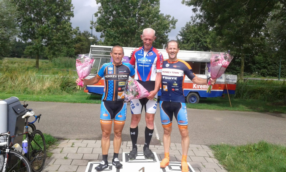 Bij de 60+ hadden we 12 renners aan de start. Al na enkele ronden de opgave van een GRTC Gouda renner. Lekker tempo in de groep. Vooraan waren het toch steeds dezelfde renners die iets ondernamen, waaronder Tromp, Hus, Blomberg, Cerfontain en Pruijsers. Na zo’n 35 minuten Arie Blomberg alleen in de aanval. Het lukte hem om 2 ronden weg te blijven. Onder aanvoering van Willem Hus werd het gat gedicht. Enkele ronden daarna ging Kees van Prooijen aan de haal. Blomberg sprong er attent naar toe en zo waren er na 45 minuten 2 koplopers. Goed samenwerkend vergrootten zij direct hun voorsprong. Bij de achtervolgers werd er te lang naar elkaar gekeken. De voorsprong bedroeg constant de gehele finishweg. Toen in de slotronden ook het pelotonnetje nog steeds geen aanstalten maakte, kon het kopduo gaan sprinten om de zege. Van Prooijen ging aan, Blomberg kwam er redelijk eenvoudig overheen. Bij de achtervolgers toonde Hus zich de snelste.