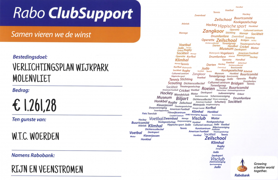 Alle stemmers van de Rabo ClubSupport actie bedankt!!! Dankzij jullie stem hebben we een fantastisch bedrag van 1261,28 euro in ontvangst mogen nemen. Met dit bedrag komen we weer een stap dichterbij de realisatie van het verlichtingsplan in het Wijkpark.