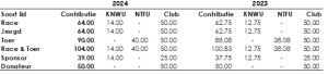 De clubbijdrage blijft gelijk maar de lidmaatschappen voor NTFU en KNWU zullen volgend jaar weer wat stijgen. De contributie voor 2024 stijgt mee met deze lidmaatschappen. Hieronder de tarieven.