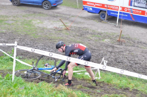 Na de nieuwelingen zijn de junioren aan de beurt. Voor WTC staan David en Pelle hier aan de start. De heren junioren schieten als raketten uit de startblokken, sommigen deden het iets te enthousiast. In deze koers tekende zich ook een tweestrijd af tussen Finn Smith en Cédric de Jager die tot de laatste ronde voortduurde. Aan de finishlijn raak ik aan de praat met de moeder van Cédric, ze stond zenuwachtig te wachten op de finish. “Nu snap ik wat sommige ouders iedere week voelen, voor mij komt dit niet zo vaak voor.” Uiteindelijk zal haar zoon het net niet halen, maar mama mag trots zijn op wat hij heeft neergezet. Bij de junioren is al duidelijk te zien dat de snelheden weer net wat hoger liggen, er wordt wat makkelijker over de boomstammetjes gesprongen en ze schieten wat sneller door de bochten. Wat ook goed te zien is, is dat het heel modderig is op het parkoers. Sommige renners moeten vaak van de fiets, of krijgen de fiets niet meer mee op de loopstukken. Ik ben zeer benieuwd hoe dit in de volgende categorieën gaat zijn.