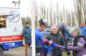 Ik kom aanrijden op een volle parkeerplaats, waar de tentjes al worden opgezet. De geur van puberzweet en gezonde spanning komt mij tegemoet. Nadat ik toch nog een vrij plekje gevonden heb, begeef ik mij naar het clubhuis. Daar zitten Astrid en Bernadette al klaar om de nummers uit te geven en de licenties in ontvangst te nemen. Als ik de heren parkoersbouwers vraag naar wat voor rondje er vandaag is neergelegd, dan krijg ik termen als “lastig”, “modderig”, “een mooi rondje” terug. Om dit met eigen ogen te ervaren, steek ik de weg over richting de fier wapperende vlaggen. Al rondkijkend zie ik dat er inderdaad een lastig rondje is uitgezet, waarbij twee de keer de krater wordt beklommen, gecombineerd met één keer de banaan, waar een verraderlijke schuine kant ligt. Die schuine kant is dan ook het punt waar veel renners hun verkenning op focussen. Ik zie angst bij sommige nieuwelingen, maar ook durfals die hem in één keer afrijden. “Dit is het mooiste rondje van het jaar!” komt mij ter ore en dan moet de koers nog beginnen…
