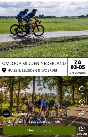 Zaterdag 3 mei a.s. wordt de Omloop Midden Nederland georganiseerd door de WTC Woerden in samenwerking met de WTC Huizen en TT Leusden.