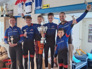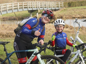 Ja, renners van verschillende leeftijd en niveau. David, deze winter crossend in cat. 6 met een heel constant seizoen en een week voordien 17e op het NK. Jerry, een oude rot van inmiddels in de 50 én Fosse, welke als 9-jarige deze winter voor het eerst actief en toch ook al derde bij de clubkampioenschappen.